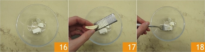 Nach dieser Zeit beginnen Sie, die Füllung vorzubereiten. Schälen Sie die Kartoffeln, schneiden Sie sie in 4 Stücke und blanchieren Sie sie etwa 40 Minuten lang, bis sie weich sind. In der Zwischenzeit geben Sie den Fiscidu-Käse in eine Schüssel 16 und fügen den geriebenen Knoblauch hinzu 17. Arbeiten Sie mit einer Gabel 18, bis Sie eine Creme erhalten.