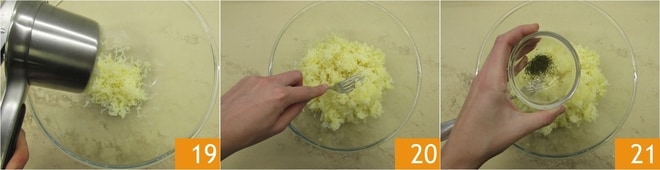 Sobald die Kartoffeln gekocht sind, gießen Sie sie gut ab und zerdrücken Sie sie in einer großen Schüssel 19. Arbeiten Sie sie mit einer Gabel 20 und fügen Sie die getrocknete Minze hinzu 21.