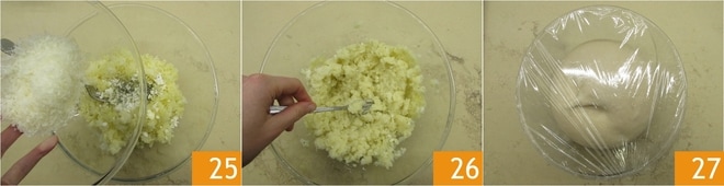 Fügen Sie den geriebenen Pecorino Sardo-Käse hinzu 25 und rühren Sie, bis Sie eine homogene Mischung erhalten 26; beenden Sie mit einem Spatel, um es weicher zu machen. Nehmen Sie jetzt Ihren Teig wieder auf 27.