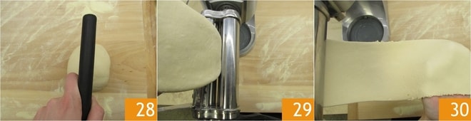Bestäuben Sie eine Arbeitsfläche mit einem Hauch Mehl, legen Sie den Teig darauf und schneiden Sie ihn in 4 Stücke. Nehmen Sie eines und lassen Sie die anderen gut abgedeckt, damit sie nicht austrocknen. Drücken Sie den Teig leicht und rollen Sie ihn mit der Nudelmaschine aus 29, bis Sie eine nicht zu dünne Platte erhalten 30.