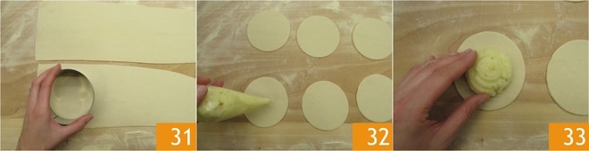 Jetzt verwenden Sie einen Ausstecher von 10 cm, um Kreise aus den Platten auszuschneiden 31. Geben Sie die Füllung in einen Spritzbeutel und drücken Sie etwa 80 g auf jeden Kreis 32. Versuchen Sie, eine kreisförmige Form zu erhalten 33.