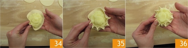 Nun kümmern Sie sich um das Schließen. Drücken Sie den Teig leicht zusammen und schieben Sie ihn zur Füllung hin 34. Dann fahren Sie fort, den ganzen Umfang zu drücken 35, bis Sie die gesamte Kreislinie abgeschlossen haben 36.
