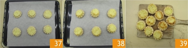 Legen Sie sie nach und nach auf ein mit Backpapier ausgelegtes Blech 37. Backen Sie sie im vorgeheizten Umluftofen bei 180° für etwa 30 Minuten. Nehmen Sie sie aus dem Ofen 38 und servieren Sie sie heiß oder bei Raumtemperatur 39.