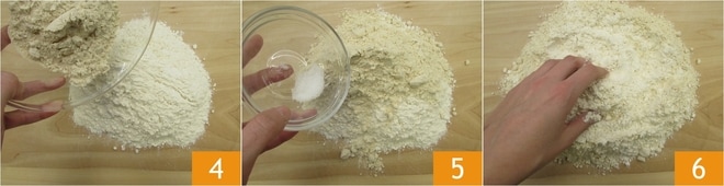 Geben Sie nun auf einer Arbeitsfläche das Weizenmehl 00 und das Hartweizenmehl Fiore Sardo 4. Fügen Sie eine Prise Salz hinzu 5 und formen Sie mit den Händen die klassische Fontäne 6.
