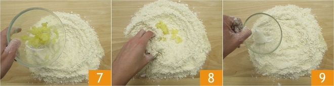 Fügen Sie die zerdrückten Kartoffeln hinzu 7 und beginnen Sie, sie mit dem Mehl zu vermischen 8. Geben Sie dann auch das Schmalz in die Mitte 9.