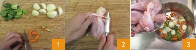 Um die Jambalaya zuzubereiten, bereiten Sie zunächst die Hühnerbrühe vor: Schälen und schneiden Sie die Zwiebel, den Sellerie und die Karotten grob 1, entfernen Sie dann die Haut von den Hühnerschenkeln mit einem Messer 2. Geben Sie sowohl das Gemüse als auch das Huhn in einen großen Topf 3,