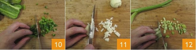 Jetzt können Sie mit der Zubereitung der Jambalaya fortfahren: Schälen und schneiden Sie die grünen Paprika 10, die Zwiebel 11 und den Sellerie 12 in kleine Würfel.
