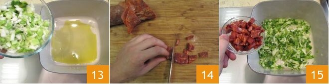 Erhitzen Sie das Öl in einem Schmortopf, fügen Sie das Gemüse hinzu 13 und braten Sie es bei mittlerer Hitze etwa 10 Minuten lang an. Schneiden Sie in der Zwischenzeit auch die Chorizo in Würfel 14. Nach 10 Minuten geben Sie die Chorizo zum Gemüse hinzu 15,
