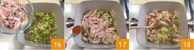 das Hühnerfleisch 16 und die Cajun-Gewürzmischung 17. Gut umrühren 18 und für weitere 10 Minuten bei mittlerer Hitze kochen.