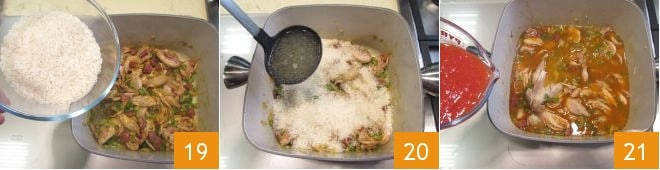 Nun fügen Sie den Reis hinzu 19 und rösten ihn eine Minute lang, dann gießen Sie die Hühnerbrühe darüber, bis alles gut bedeckt ist 20. Fügen Sie auch die Tomatensauce hinzu 21,