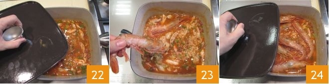 decken Sie mit dem Deckel ab 22 und lassen Sie es etwa 18 Minuten oder so lange kochen, wie auf der Packung des Reises angegeben, und überprüfen Sie gelegentlich, ob die Flüssigkeit nicht zu sehr verdampft ist. Nach 10 Minuten geben Sie die ganzen Garnelen hinzu 23, schließen Sie mit dem Deckel 24 und setzen Sie das Kochen fort. Nach der Garzeit des Reises sollte die Jambalaya am Boden noch leicht flüssig sein.