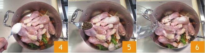 fügen Sie das grobe Salz 4 und die Pimentkörner 5 hinzu, dann bedecken Sie alles mit Wasser 6.