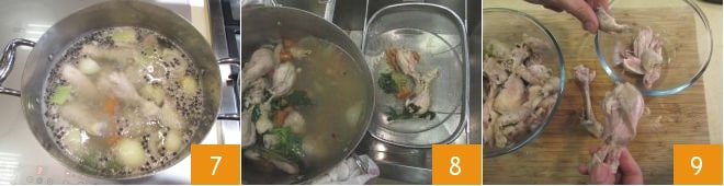 Kochen Sie die Brühe 50 Minuten ab dem Moment, in dem das Wasser zu kochen beginnt 7. Nach dieser Zeit filtern Sie die Brühe 8 und stellen Sie sie warm beiseite, dann lösen Sie das Hühnerfleisch von den Knochen und Sehnen 9.