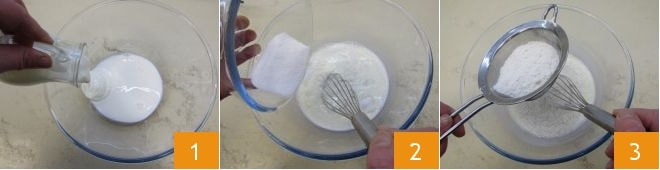 Um den Joghurt-Apfel-Kuchen ohne Eier zuzubereiten, lasst zunächst alle frischen Zutaten eine Weile außerhalb des Kühlschranks stehen: Auf diese Weise könnt ihr sicher sein, dass der Kuchen optimal gelingt, da alle Zutaten die gleiche Raumtemperatur haben werden. Dann gebt die Milch in eine Schüssel zusammen mit dem griechischen Joghurt 1, rührt sie mit einem Schneebesen glatt und fügt den Zucker hinzu 2. Rührt gründlich um, dann stellt ein Sieb auf die Schüssel und siebt das Mehl hinein 3