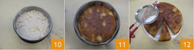 Glättet den Kuchen mit einem Spatel 10 und backt ihn im vorgeheizten statischen Ofen bei 170°C für etwa 55 Minuten (für dieses Rezept wird das Backen im Umluftofen nicht empfohlen, da der Kuchen zu trocken werden könnte; wenn ihr es dennoch ausprobieren möchtet, ist die ideale Backtemperatur 160°C für etwa 45-50 Minuten), macht dabei unbedingt die Stäbchenprobe: Wenn das Stäbchen trocken herauskommt, ist der Kuchen gar. Wir empfehlen außerdem, den Kuchen während des Backens mit Alufolie zu bedecken, falls die Oberfläche zu dunkel wird. Nehmt den Joghurt-Apfel-Kuchen ohne Eier aus dem Ofen und lasst ihn vollständig abkühlen, bevor ihr ihn aus der Form löst 11. Wenn ihr möchtet, serviert euren Joghurt-Apfel-Kuchen ohne Eier mit einer Prise Puderzucker 12.
