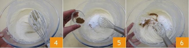 rührt energisch, um das Mehl zu absorbieren und Klümpchenbildung zu vermeiden 4. Danach fügt das Backpulver und den Zimt hinzu 5 und mischt sie weiter in die Masse ein 6.