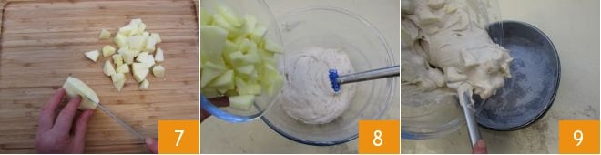 Jetzt könnt ihr die Äpfel schälen und das Kerngehäuse entfernen (ihr erhaltet etwa 300 g Äpfel). Schneidet sie in Scheiben und würfelt sie in etwa 2 cm große Stücke 7. Gebt die Stücke nach und nach sofort in die Schüssel mit der Teigmasse, um zu verhindern, dass die Würfel braun werden 8. Vermischt alles gut mit einem Spatel und gebt die Masse in eine 24 cm Durchmesser Springform, mit Backpapier ausgelegt 9.