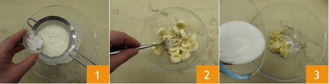 Um die Joghurt-Bananen-Küchlein ohne Eier zuzubereiten, beginnen Sie damit, das Mehl 00 und das Backpulver zu sieben, dann mischen Sie es und stellen Sie es beiseite 1. Schälen Sie die Bananen, schneiden Sie sie in Scheiben und geben Sie sie in eine Schüssel; Sie benötigen etwa 100 g Fruchtfleisch. Zerdrücken Sie sie mit der Gabel 2, dann fügen Sie den Zucker hinzu 3.