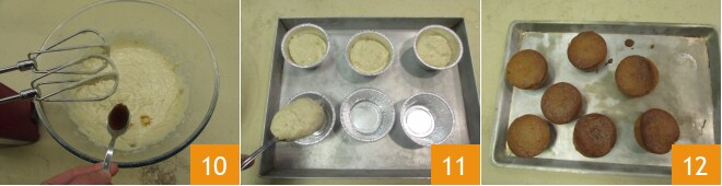 Aromatisieren Sie mit Vanilleessenz 10 und rühren Sie gut, um alles zu vermengen. Gießen Sie die Mischung in 8 Alu-Förmchen 11 und backen Sie sie im vorgeheizten statischen Ofen bei 180°, für ca. 25 Minuten. Einmal abgekühlt, stürzen Sie die Küchlein aus den Förmchen und bestäuben Sie Ihre Joghurt-Bananen-Küchlein ohne Eier mit Puderzucker 12!