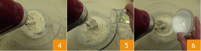 Beginnen Sie, mit den elektrischen Schneebesen zu arbeiten 4 und fügen Sie, während Sie immer weiter rühren, das Öl 5 und den Joghurt hinzu 6.