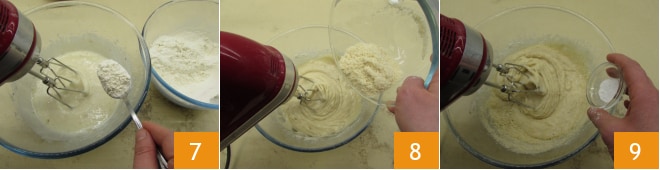 Fügen Sie schließlich die gesiebte Pulver-Mischung hinzu 7, das Mandelmehl 8, das Salz und das Natron 9.