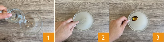 Um die Joghurt-Focaccia zuzubereiten, geben Sie die Hefe und das Wasser in eine kleine Schüssel 1, rühren Sie um, bis sie sich aufgelöst hat 2. Fügen Sie dann den Honig hinzu 3 und rühren Sie gut um.