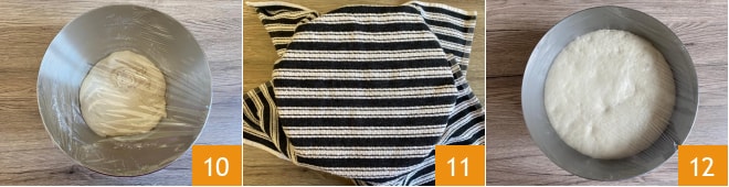 Decken Sie ihn mit Frischhaltefolie 10 und einem Tuch 11 ab und lassen Sie ihn bei ausgeschaltetem Ofen mit eingeschaltetem Licht gehen, bis er sein Volumen verdreifacht hat 12. Das dauert etwa 3 Stunden.
