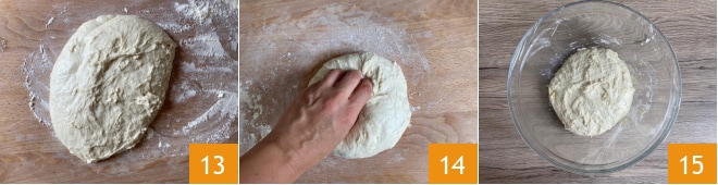 Nehmen Sie den Teig wieder und geben Sie ihn auf die bemehlte Arbeitsfläche 13. Arbeiten Sie ihn schnell, ohne ihn zu sehr zu entgasen, und formen Sie eine Kugel 14. Legen Sie ihn in eine Schüssel, decken Sie ihn mit Frischhaltefolie 15 und mit dem Tuch ab und lassen Sie ihn erneut im ausgeschalteten Ofen mit eingeschaltetem Licht gehen. Diesmal reicht eine Stunde, und der Teig sollte sich verdoppeln.