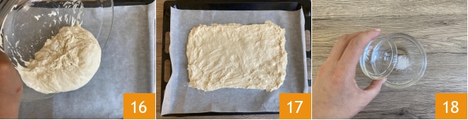 Nehmen Sie den Teig wieder und geben Sie ihn auf ein mit Backpapier ausgelegtes Blech 16. Dehnen Sie den Teig vorsichtig mit den Händen, indem Sie die seitlichen Ränder vorsichtig ziehen, um eine rechteckige Form zu erhalten 17. Bereiten Sie eine schnelle Salzlake vor, indem Sie in einer kleinen Schüssel das Wasser und das Salz vermischen 18