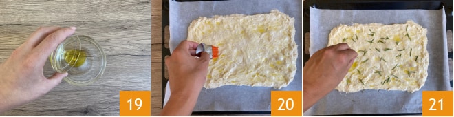 und das Öl 19. Gut mischen und verwenden Sie es, um die Oberfläche der Focaccia zu bestreichen 20. Beenden Sie mit ein paar Rosmarinnadeln 21,