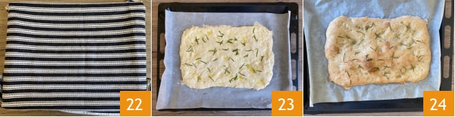 decken Sie es mit dem Tuch ab 22 und lassen Sie es eine halbe Stunde ruhen 23. Backen Sie es dann im vorgeheizten statischen Ofen bei 200° auf der mittleren Schiene etwa 25 Minuten oder bis die Focaccia goldbraun ist (je nach Leistung Ihres Ofens). Dann aus dem Ofen nehmen 24 und die Joghurt-Focaccia servieren.