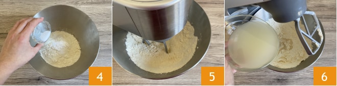 Geben Sie das Mehl und das Salz in die Schüssel einer Küchenmaschine 4, montieren Sie den Flachrührer und schalten Sie ihn für ein paar Sekunden ein, um die Mischung zu lockern 5. Gießen Sie dann die aufgelöste Hefe hinzu 6,