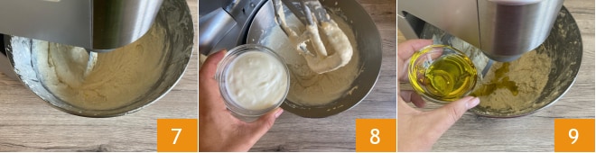 und schalten Sie die Maschine auf niedriger Geschwindigkeit ein, bis alles gut vermischt ist 7. Fügen Sie den Joghurt hinzu 8 und lassen Sie die Maschine laufen, bis er vollständig aufgenommen ist. Fügen Sie zuletzt das Öl hinzu 9. Schalten Sie die Küchenmaschine erneut ein, und wenn Sie einen homogenen Teig erhalten haben, erhöhen Sie die Geschwindigkeit und warten Sie, bis der Teig gut verbunden ist.