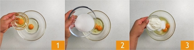 Um den Joghurtkuchen mit Schokostückchen zuzubereiten, geben Sie die Eier 1 mit dem Zucker 2 und dem Joghurt 3 in eine Schüssel.