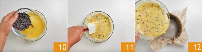 Fügen Sie auch die Schokostückchen hinzu 10 und mischen Sie ein letztes Mal mit einem Spatel 11; gerade lange genug, um einen homogenen Teig zu erhalten. Dann gießen Sie ihn in eine mit Backpapier ausgelegte 22 cm Form 12.