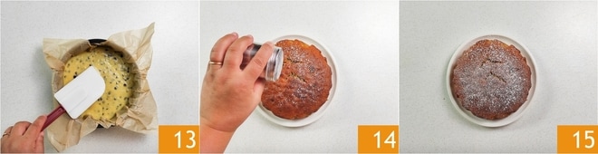 Glätten Sie die Oberfläche gut 13 und backen Sie im vorgeheizten statischen Ofen bei 180°C für 45 Minuten. Bevor Sie den Kuchen herausnehmen, machen Sie immer die Stäbchenprobe. Lassen Sie den Kuchen mit leicht geöffneter Ofentür abkühlen. Danach nehmen Sie ihn heraus, lösen ihn aus der Form und bestäuben ihn vor dem Servieren mit Puderzucker 14 15.