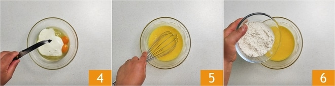 Fügen Sie die Samen hinzu, die Sie aus einer Vanilleschote entnommen haben 4, und schlagen Sie sie mit einem Schneebesen 5. Sobald alle Zutaten gut vermengt sind, fügen Sie auch das gesiebte Mehl hinzu 6.