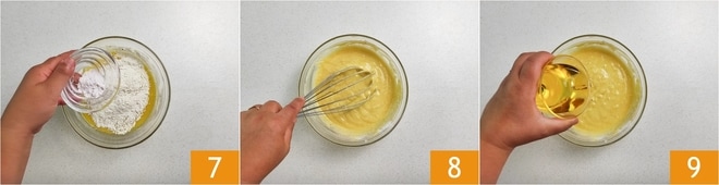 Zuletzt sieben Sie auch das Backpulver und fügen es dem Teig hinzu 7; mischen Sie gut mit einem Schneebesen, um eine glatte, klumpenfreie Mischung zu erhalten; dann fügen Sie das Öl hinzu 9 und mischen Sie gut, um es zu integrieren.