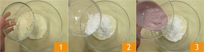 Um die Joghurtpralinen herzustellen, geben Sie das Mandelmehl in eine Schüssel 1, dann fügen Sie den Puderzucker 2 und das Waldfrüchtejoghurt 3 hinzu.