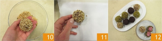Nachdem sie vollständig umhüllt ist 10, legen Sie sie auf ein Blatt Backpapier 11 und verfahren Sie so mit allen anderen Pralinen, indem Sie die Ummantelung aus Haselnüssen, Pistazien und Streuseln abwechseln. Ihre Joghurtpralinen sind bereit zum Servieren 12!