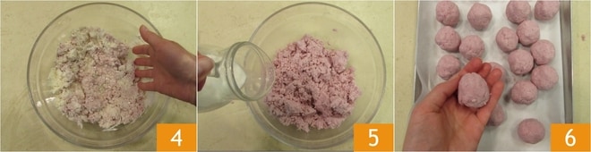 Vermischen Sie die Zutaten mit einem Löffel oder mit den Händen 4, dann geben Sie auch die Sahne hinzu 5 und kneten Sie alles, bis Sie eine homogene Masse erhalten. Formen Sie Kugeln mit einem Gewicht von etwa 25 g jeder 6; mit dieser Menge erhalten Sie etwa 24 Stück.