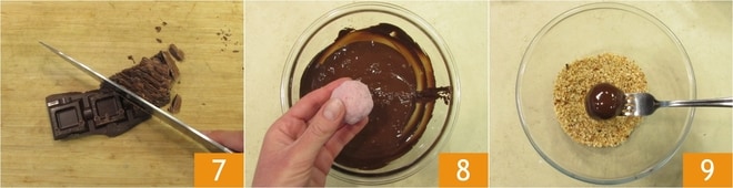 Nun hacken Sie die Zartbitterschokolade 7 und schmelzen Sie sie im Wasserbad oder in der Mikrowelle. Geben Sie die gehackten Nüsse und die Streusel in separate Schüsseln. Tauchen Sie eine Kugel nach der anderen in die geschmolzene Schokolade 8, dann wälzen Sie sie in den Nüssen 9.
