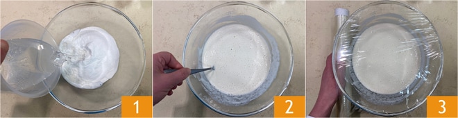 Um den Kabeljau in Tempura mit Brokkoli zuzubereiten, stellen Sie zuerst den Teig her. Geben Sie in eine Schüssel das Mehl, das Mehl 00 und das kalte Sprudelwasser 1. Mischen Sie mit einer Gabel 2 und machen Sie sich keine Sorgen, wenn es nicht perfekt glatt ist 3. Decken Sie die Schüssel mit Folie ab und stellen Sie sie für etwa 30 Minuten in den Kühlschrank, oder so lange, bis Sie mit den anderen Zubereitungen fortfahren.