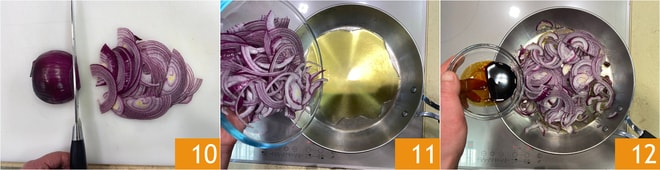 Bereiten Sie auch die karamellisierten Zwiebeln vor. Schälen Sie sie und schneiden Sie sie in Scheiben 10. Legen Sie sie in eine Pfanne mit etwas Öl 11 und fügen Sie den Balsamico-Essig hinzu 12.