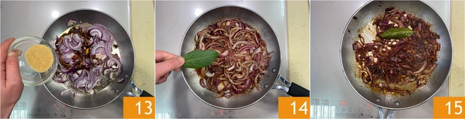 Fügen Sie auch den braunen Zucker 13, ein Lorbeerblatt 14 hinzu und kochen Sie bei niedriger Hitze für 15 Minuten. Die Zwiebeln sollten gut karamellisiert sein 15.