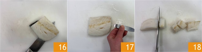 Entfernen Sie die Haut des Kabeljaus 16, entfernen Sie die Gräten mit einer Pinzette 17 und schneiden Sie ihn in Würfel 18.