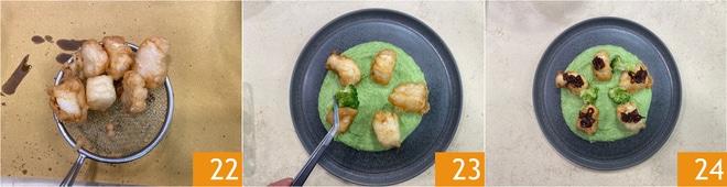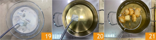 Tunken Sie den Kabeljau in den Teig, so dass die Würfel gleichmäßig bedeckt sind 19. Dann tauchen Sie sie in das heiße Öl 20, einige Stücke gleichzeitig, um die Temperatur des Öls nicht zu senken 20. Lassen Sie sie ab, wenn sie goldbraun sind 21.