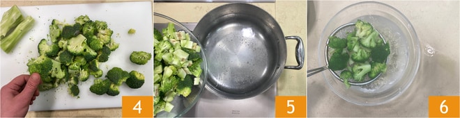 Reinigen Sie den Brokkoli und trennen Sie die Röschen 4; schälen Sie den Stiel gut und schneiden Sie ihn in Würfel. Blanchieren Sie alles für 4 Minuten in gesalzenem Wasser 5, dann abgießen und in Eiswasser geben 6.