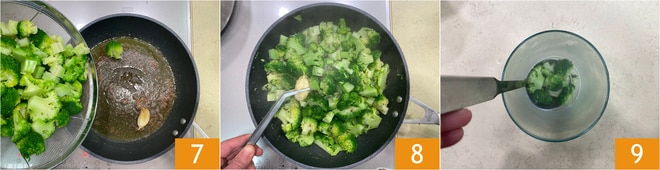 Bereiten Sie inzwischen ein Sauté mit Öl, Knoblauch und den Sardellen zu. Sobald sie geschmolzen sind, fügen Sie die abgetropften Brokkoli hinzu 7. Sautieren Sie für weitere 5 Minuten, dann entfernen Sie die Knoblauchzehe 8 und geben Sie die Brokkoli in einen hohen, schmalen Behälter 9. Bewahren Sie einige Röschen zur Dekoration der Teller auf und pürieren Sie den Rest, indem Sie eine Kelle Kochwasser hinzufügen, bis Sie eine Creme erhalten.