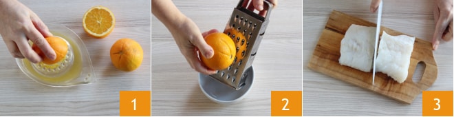 Um den Kabeljau mit Orange zuzubereiten, pressen Sie zuerst den Orangensaft 1 aus und reiben Sie die Schale ab 2. Nehmen Sie den entsalzten Kabeljau und schneiden Sie ihn in vier Teile 3.